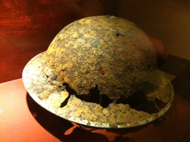 Left: The classic British water bottle and Right: a rusty Britsh Tommy helmet.